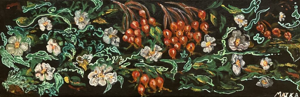 Motivation: Combining beauty and a healthy lifestyle in one plant, The Rosehip, a tiny wonder of nature, delights passersby with its delicate, fluttering transparent flowers and has long been used for its health benefits. People drink its red fruit as a tea. The painting for decorate the kitchen of your cozy apartment