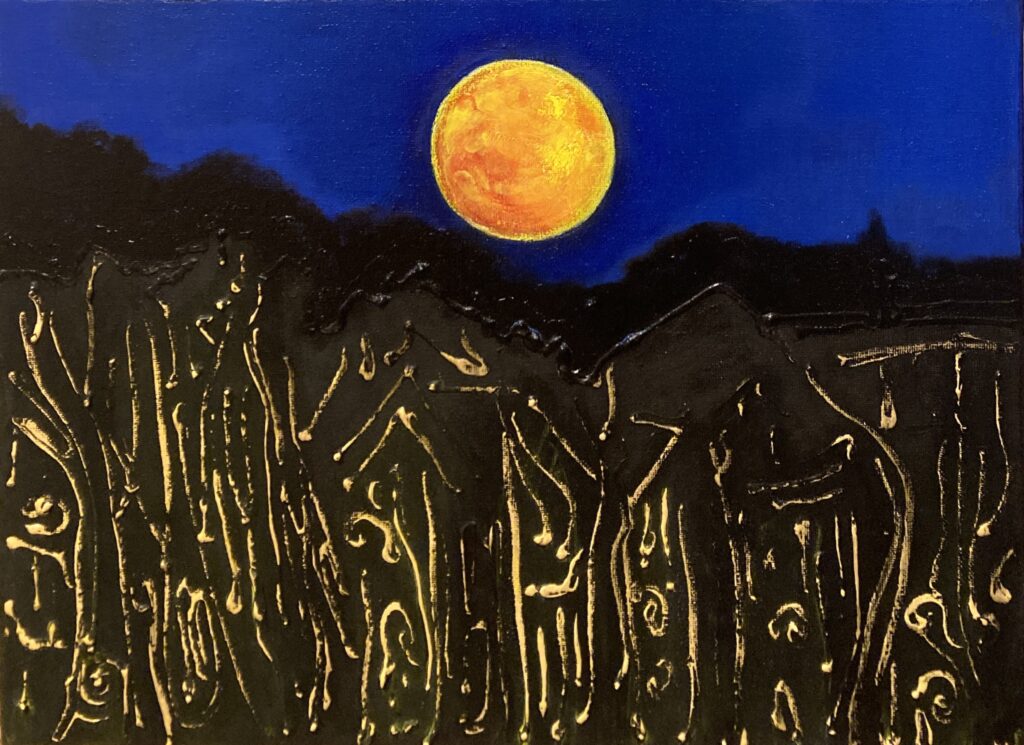 Motivation: The May 2025 moon, ethereal glow whose brightness woked the artist in the middle of the night, she opened eyes and saw this amazing picture in the window. The huge moon was surrounded by harsh bright light and stood above the tall trees and roofs of houses. The reality that the artist later transferred to the canvas was also recorded by NASA